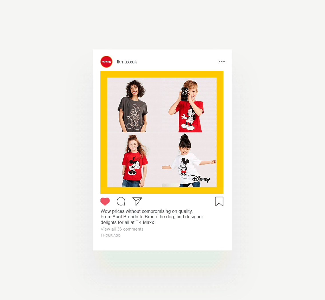 As lead designer, I developed the campaign’s visual identity, from concept and art direction to collaborating with a motion designer and creating all rollout assets. TK Maxx X DisneyCharity Campaign